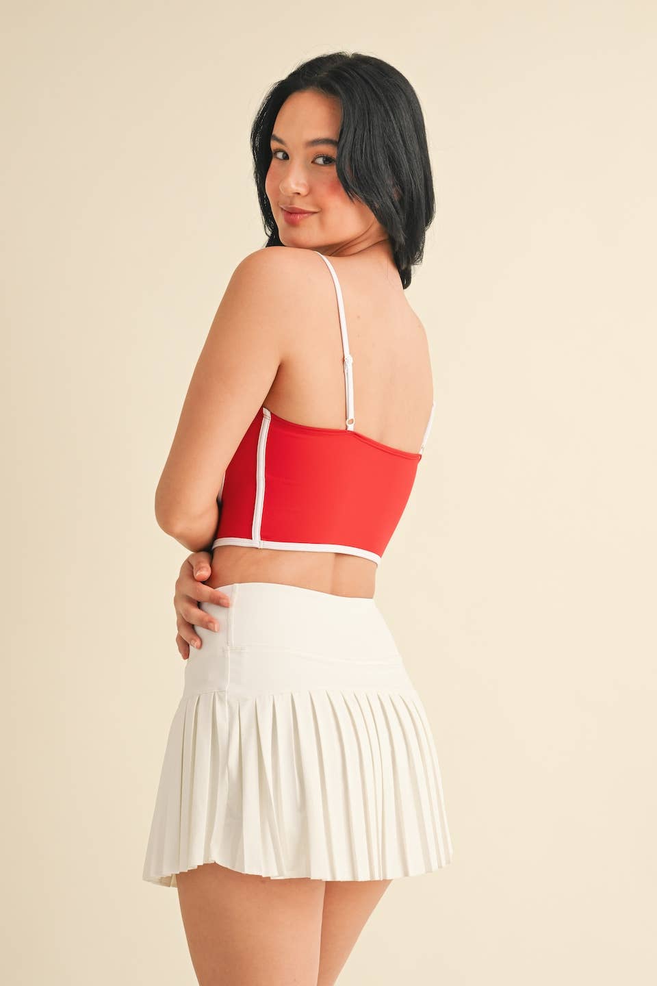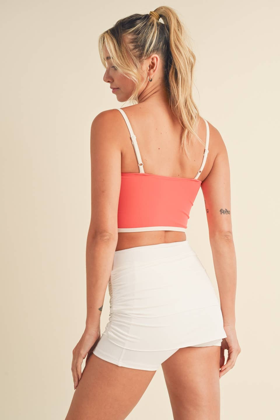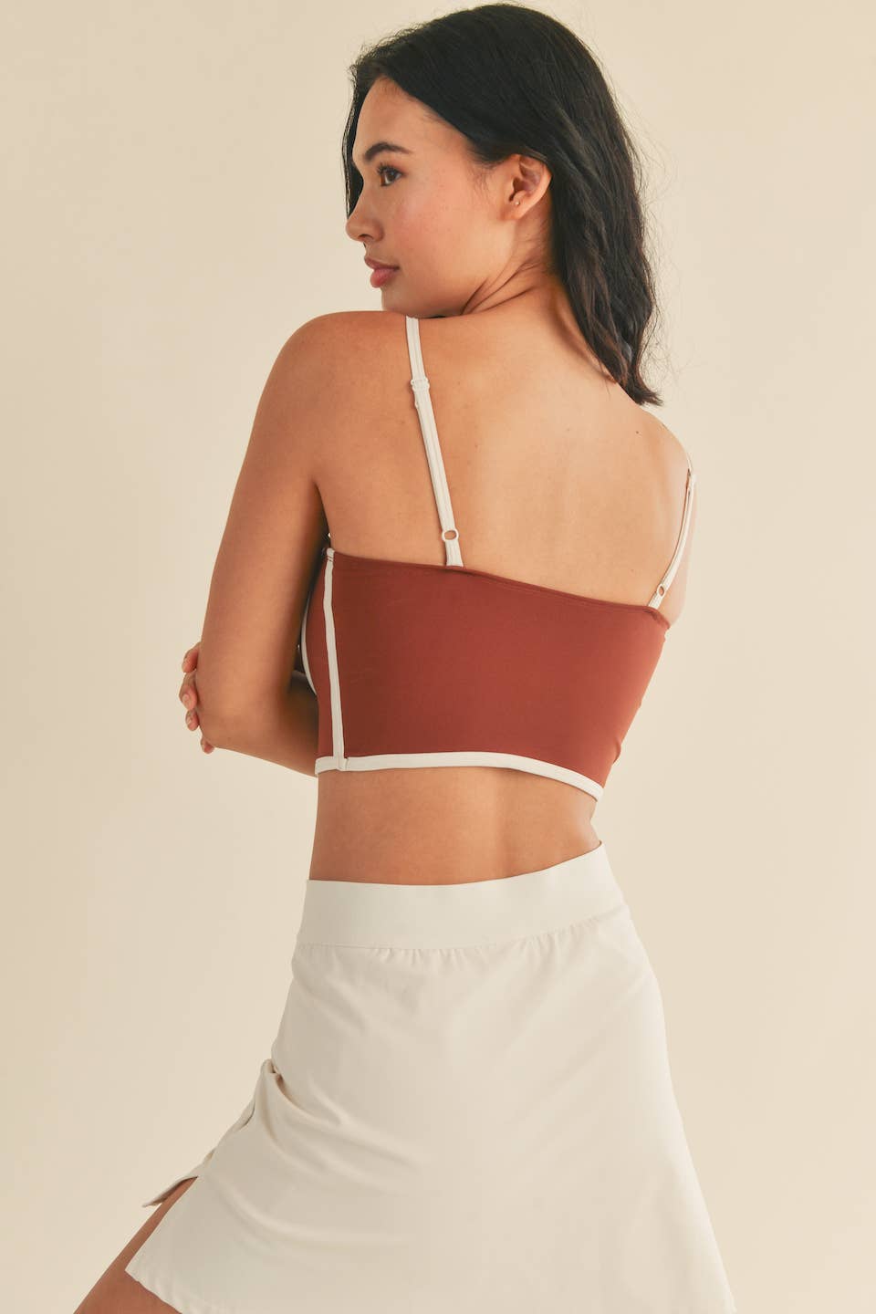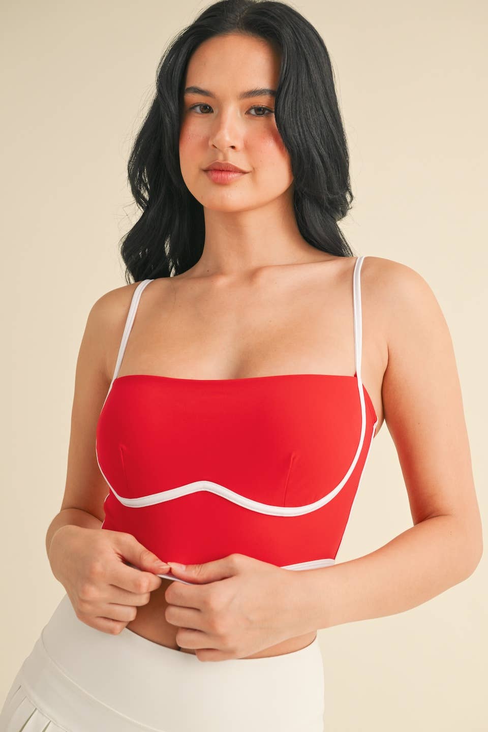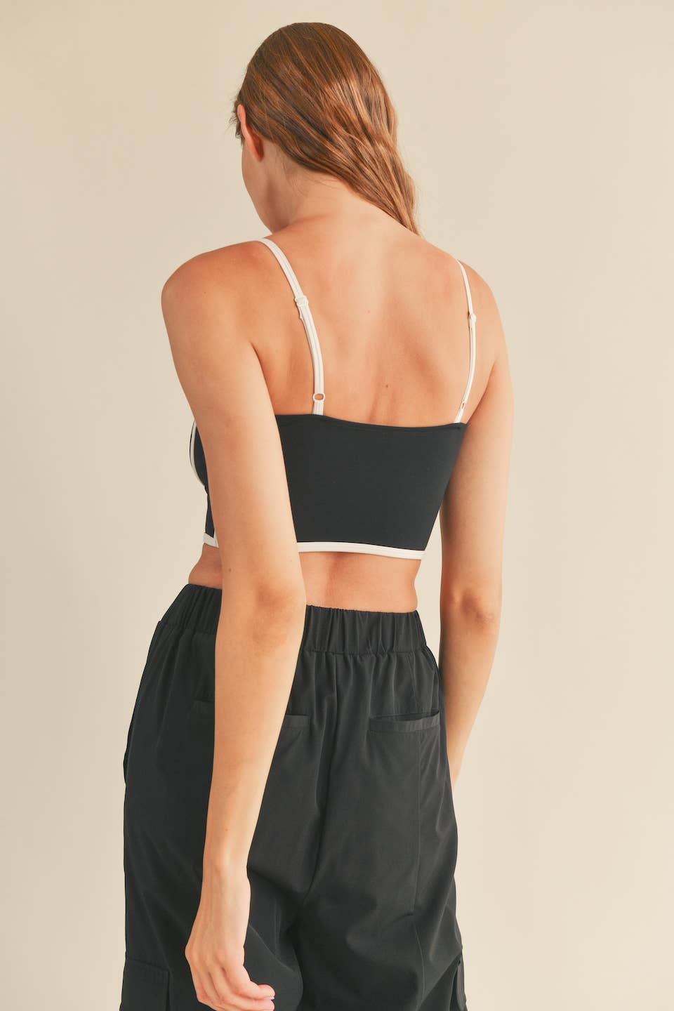 Built in shelf bra gives light to medium support with piping detail and adjustable straps