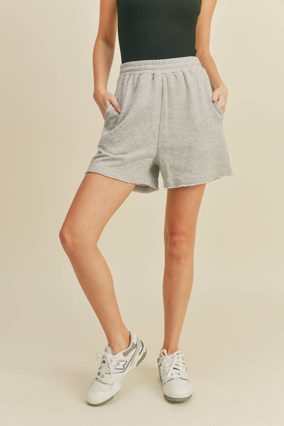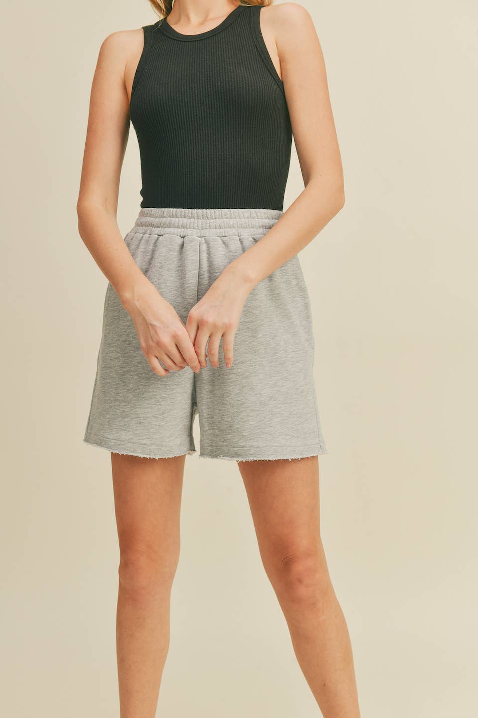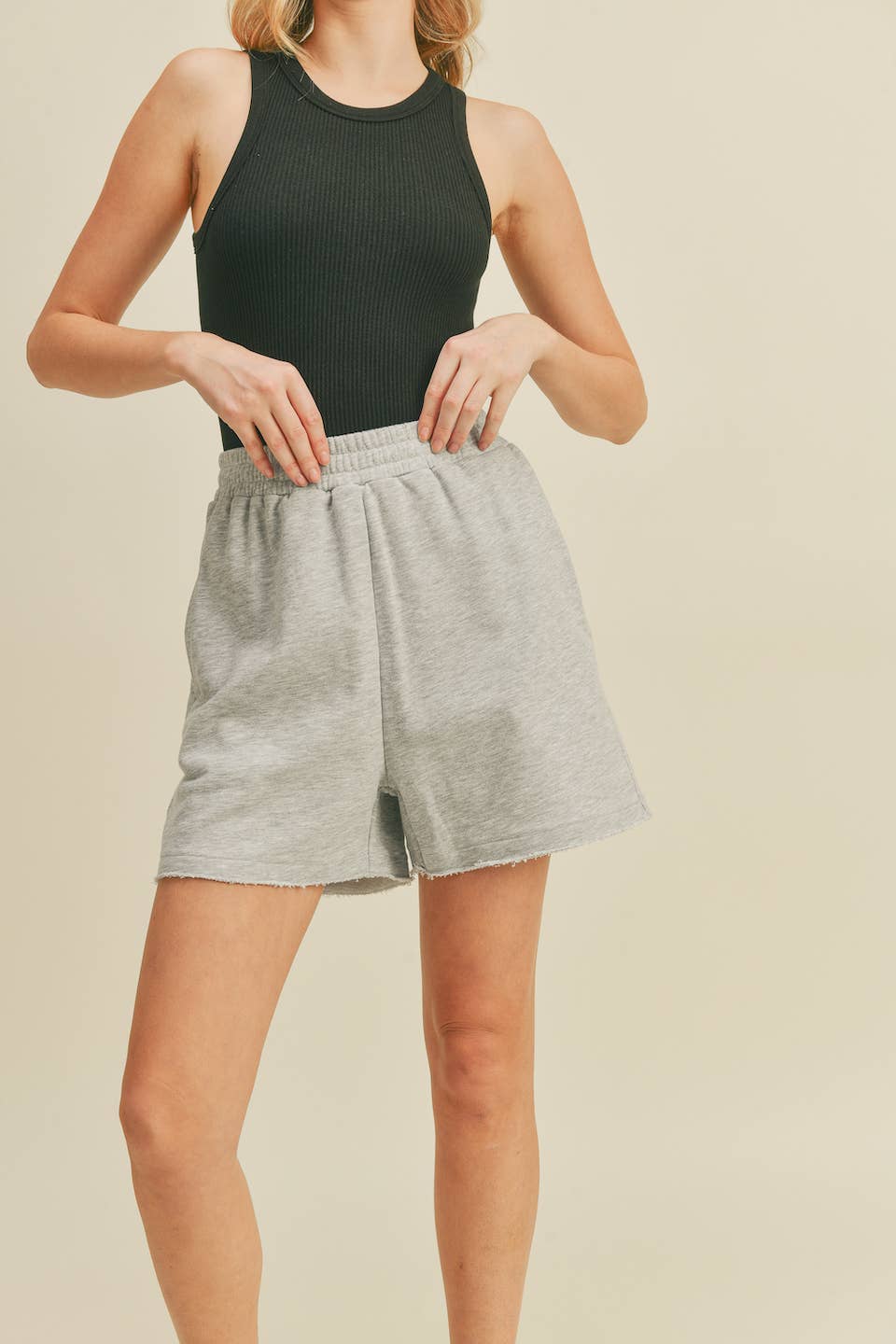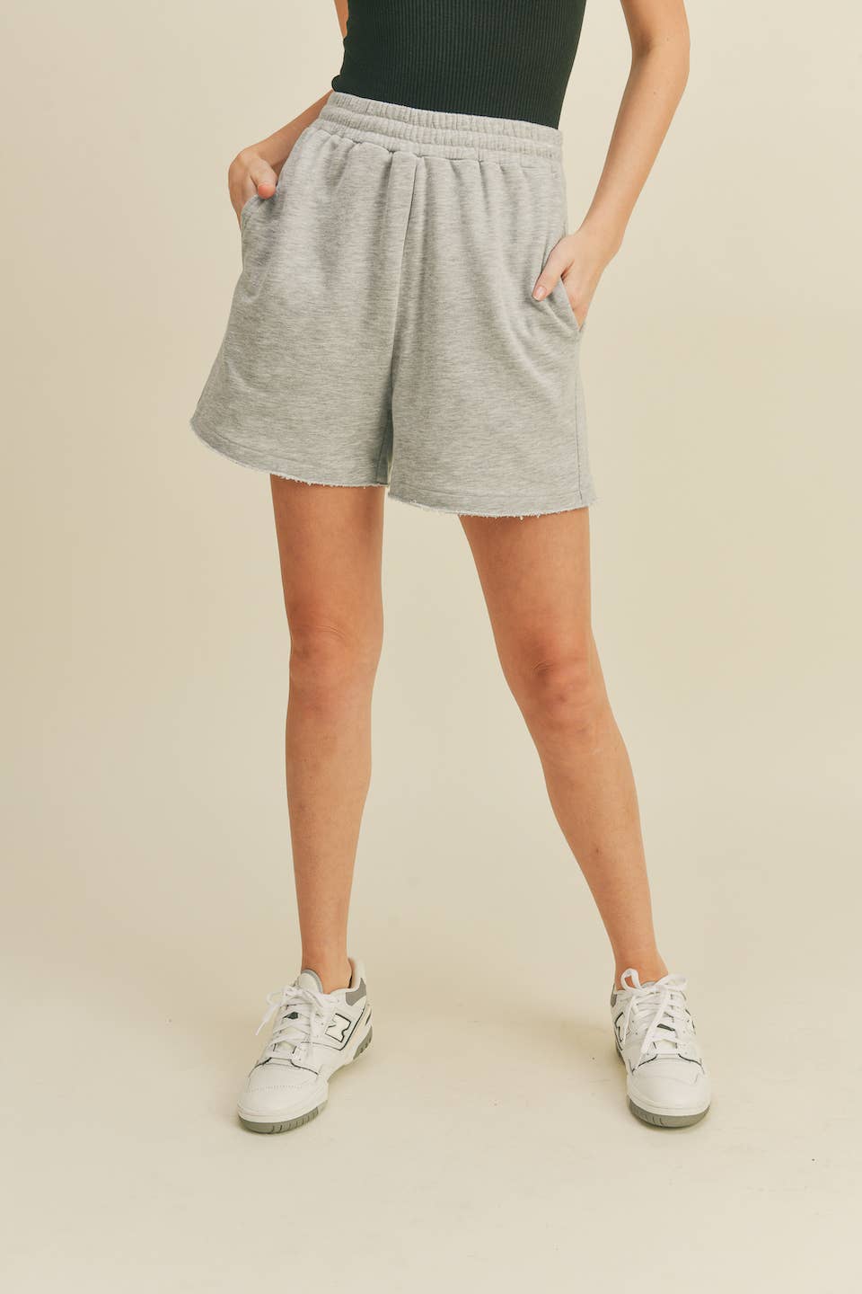 Relaxed fit with elastic waist and raw edges. Made with soft cotton french terry.