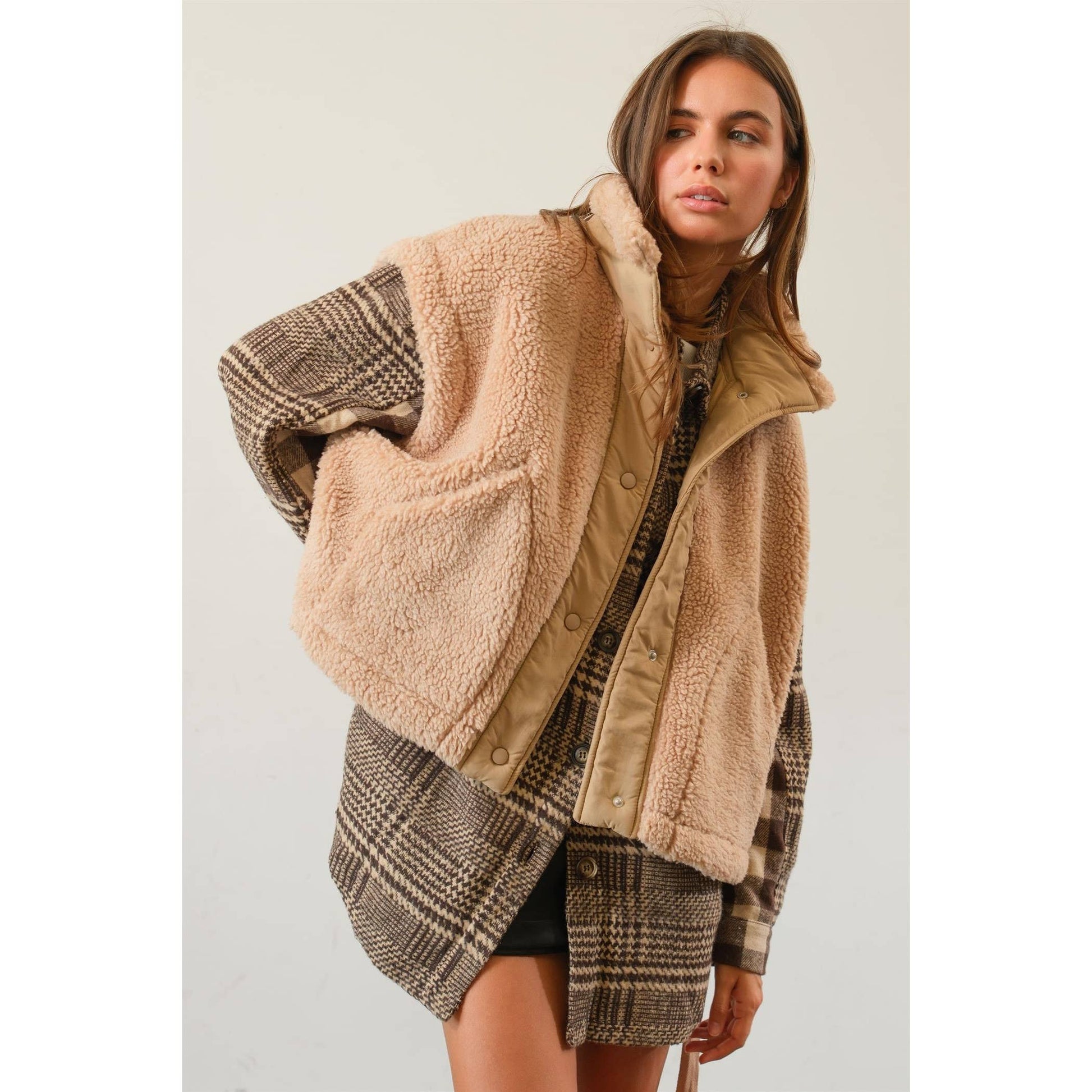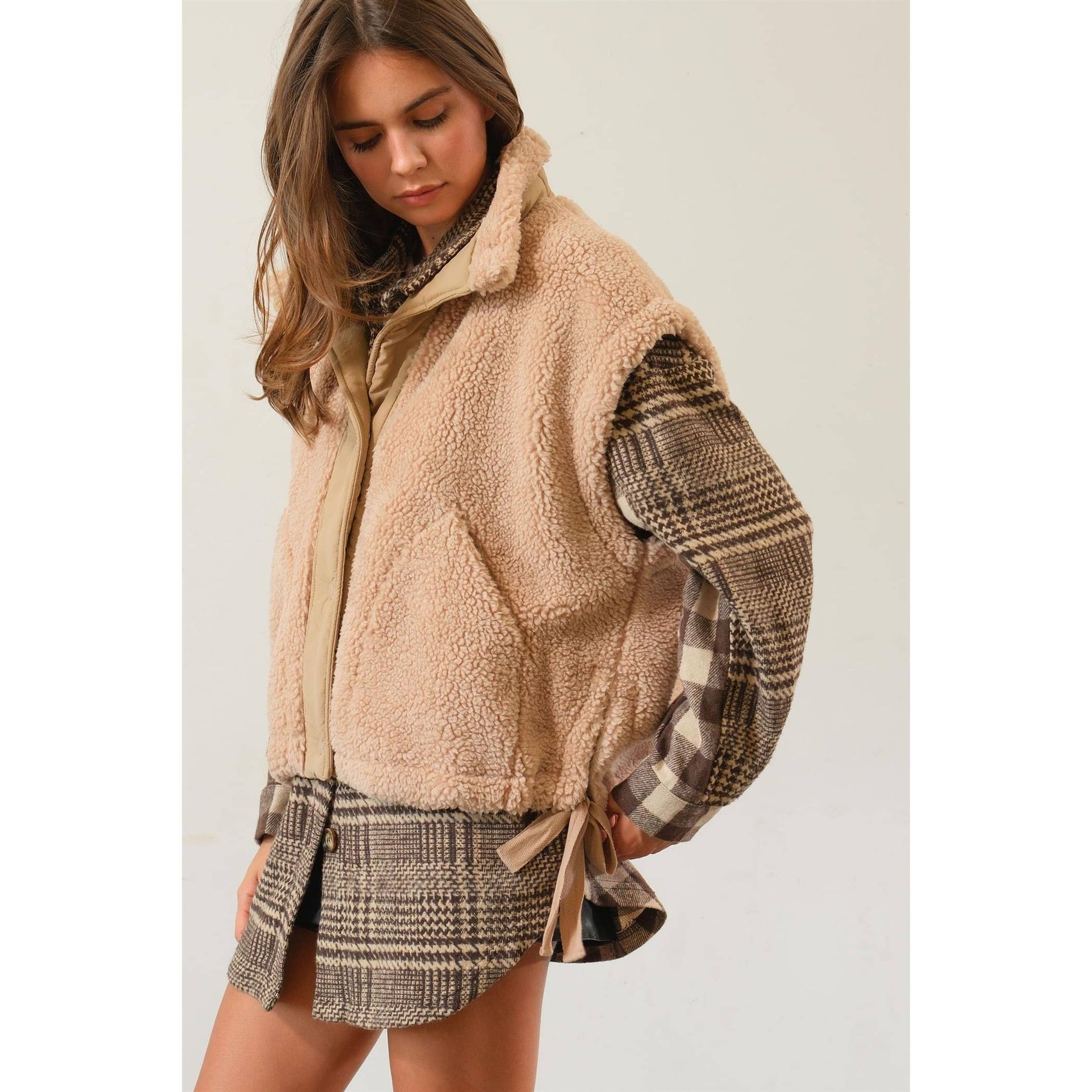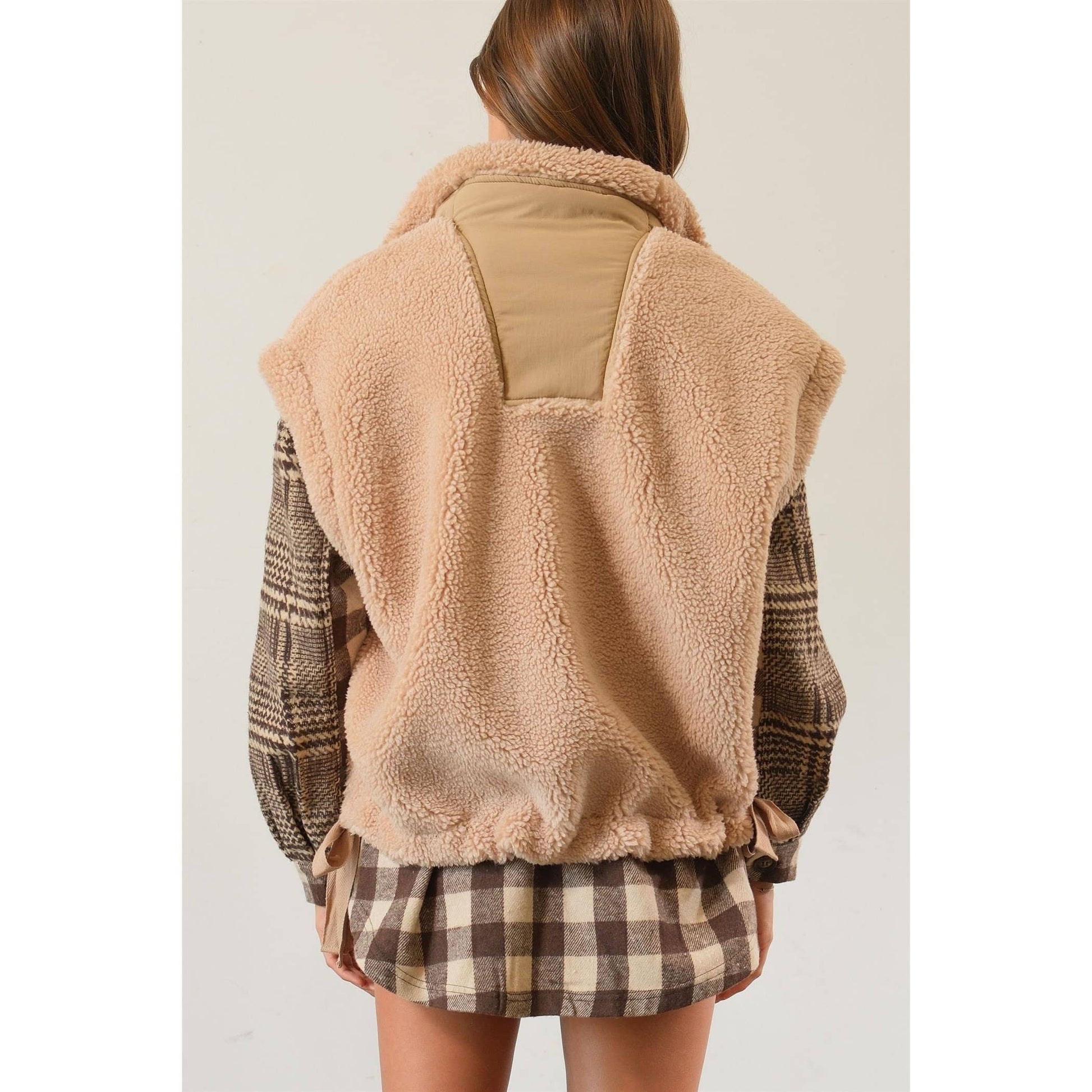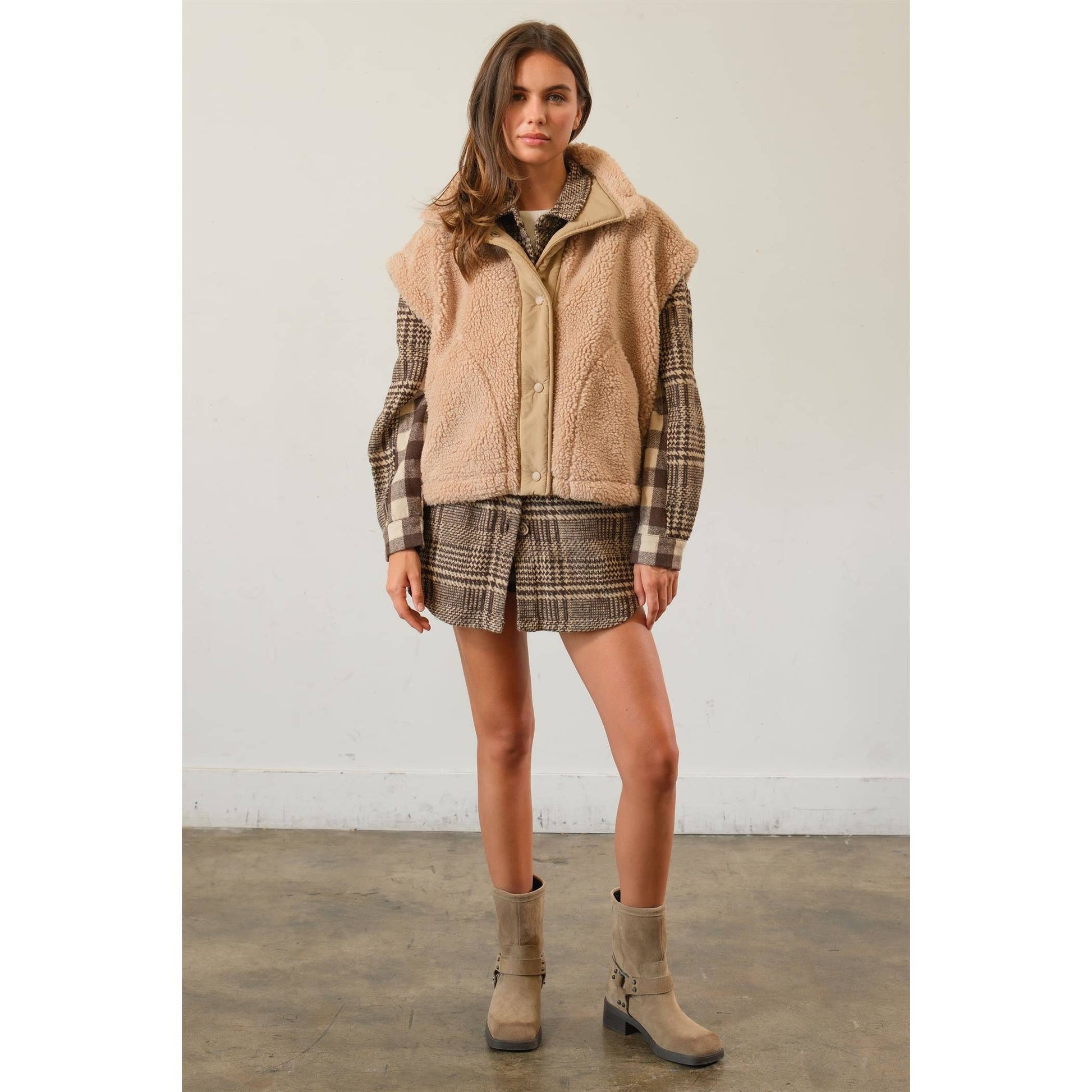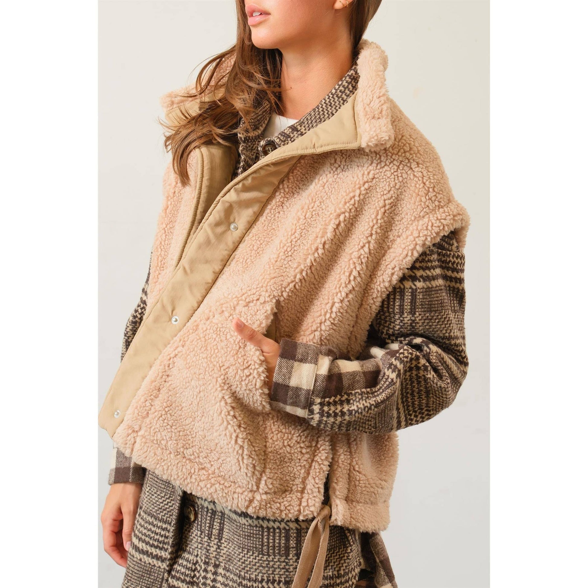 The Vest Boasts A Snap Button Placket Down The Front That Makes It Easy To Slip On And Off, While The Oversized Cut Creates A Cap Sleeve Effect. The Sherpa Composition Keeps You Cozy, Making It Ideal For Casual Wear Or Outdoor Adventures. 100% Polyester