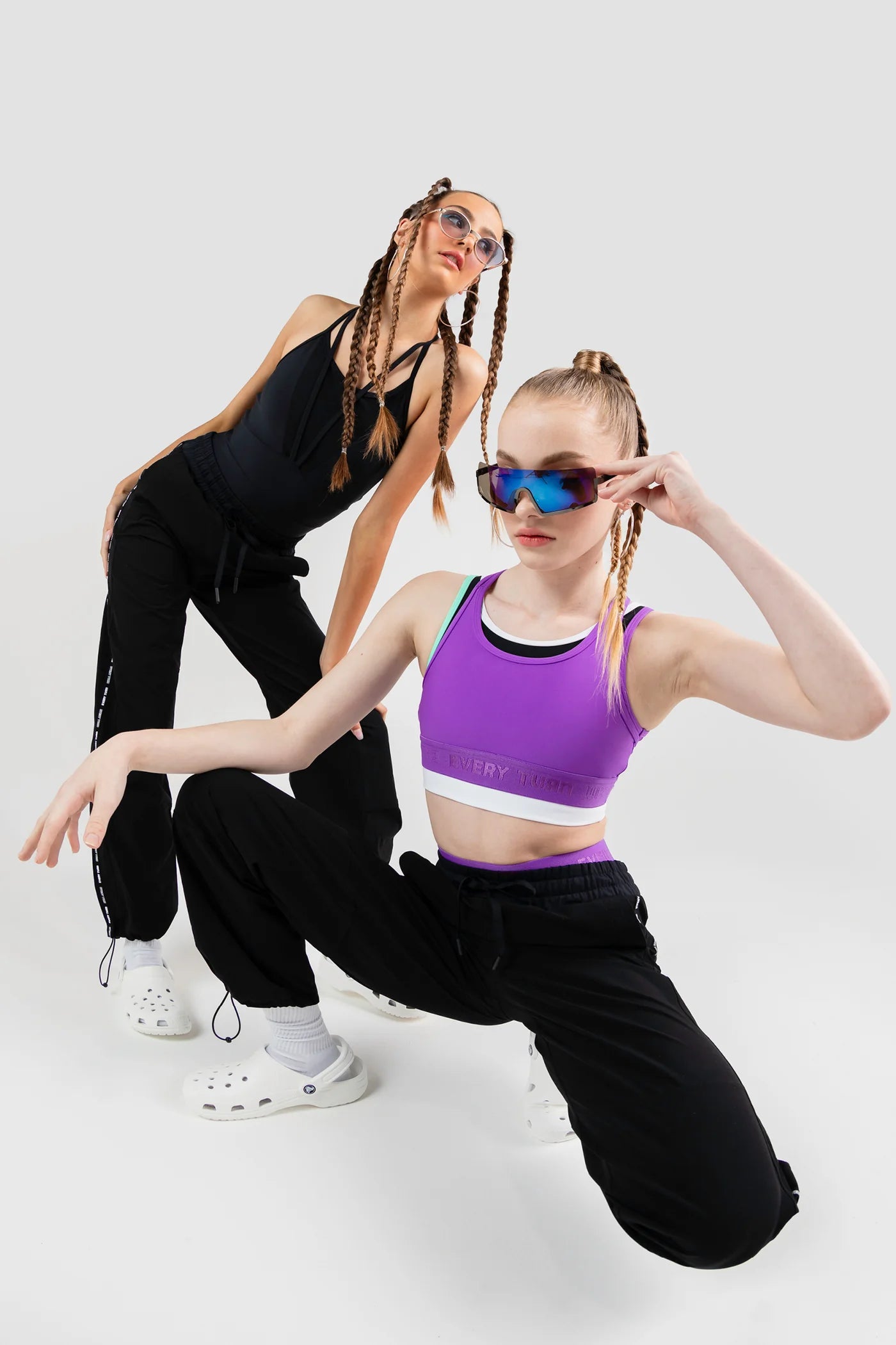 High kicks and turns are a breeze in the Restart Utility Pant. A high waisted, wide leg street styled pant with detailed topstitching and seams that is perfect for everyday use. Branded elastic trim runs the length of the pant with bungee cords at the hem, wear scrunched up or wide.