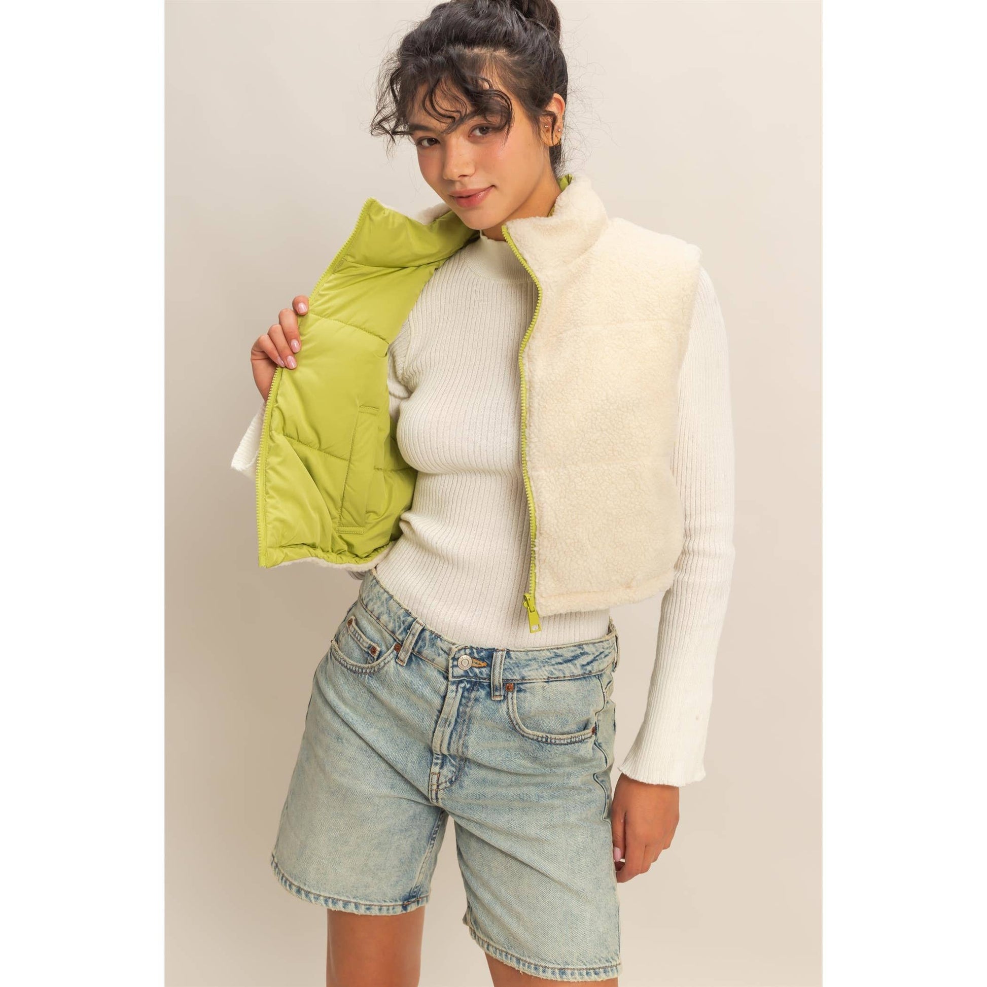 With a sherpa fabric inside, its reversible quality will make you want to wear this vest again and again, adorned with a zipper closure at front. Side pockets complete the look.
