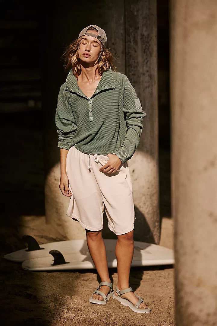 So cozy and effortlessly chic, this top features a soft fabrication with relaxed silhouette and loose pleating, with ribbed detailing and snap buttons.