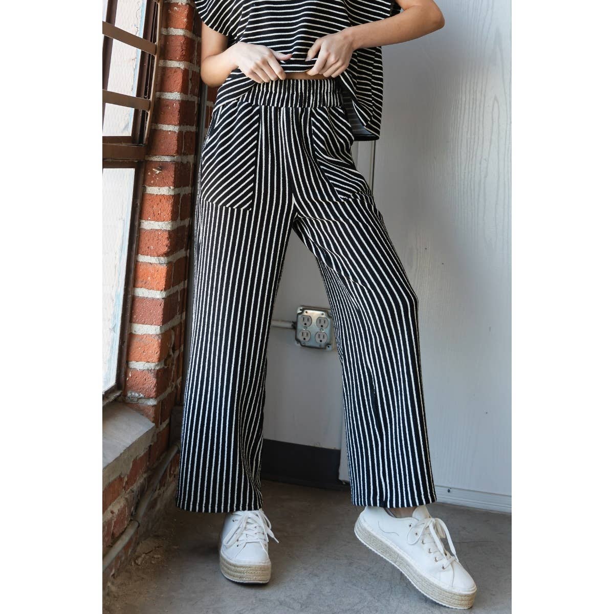 Stripe Texture Knit Front Pocket Long Pants- Black
