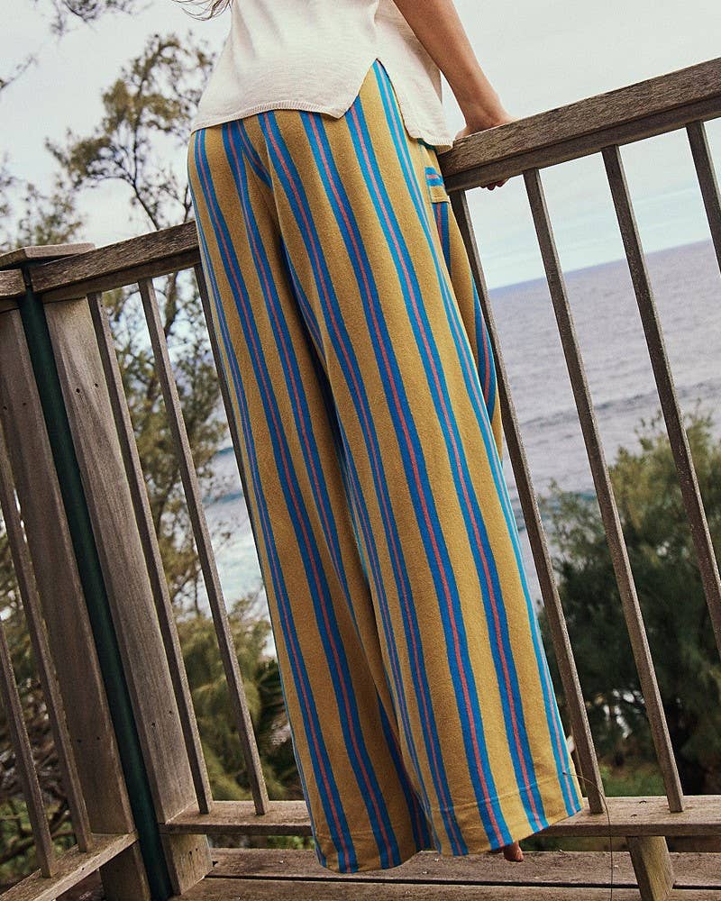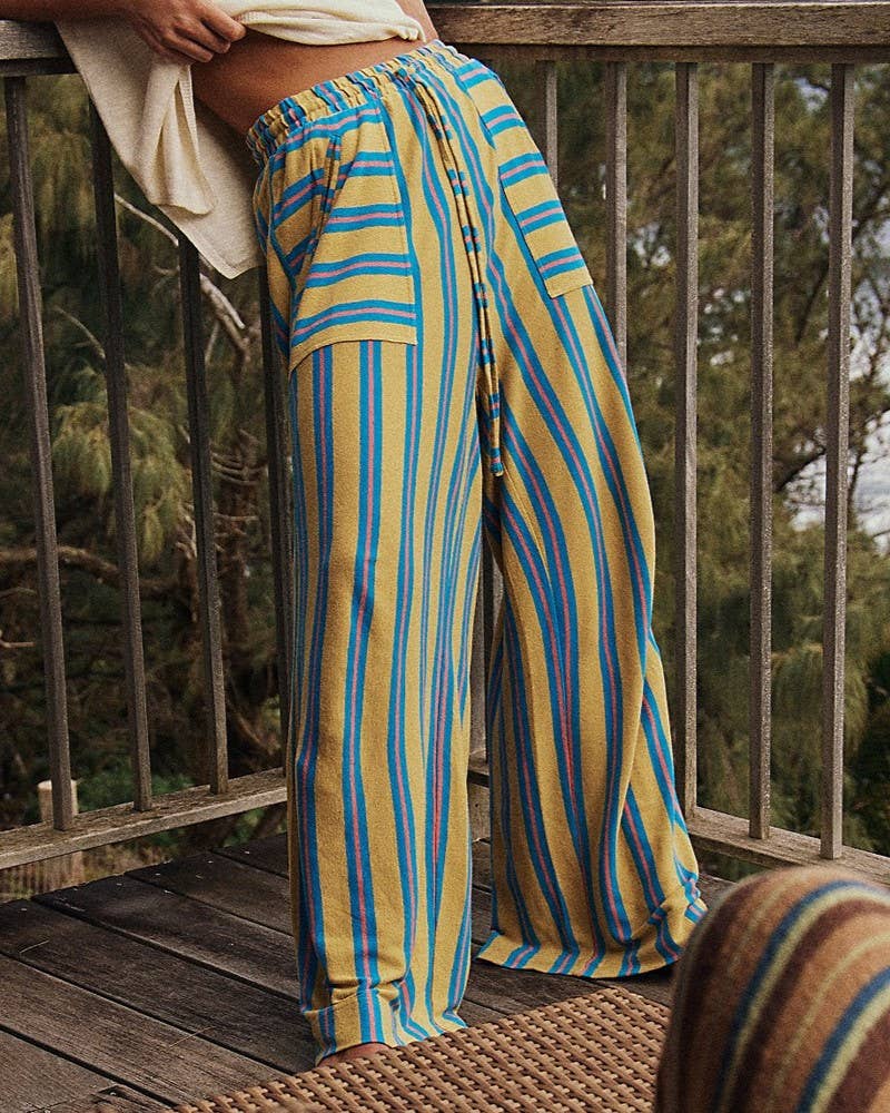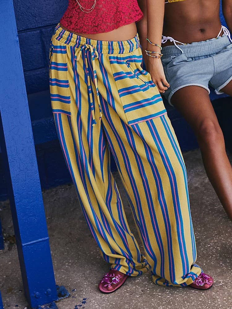 Striped Beach Homely Drawstring Wide-Leg Trousers: Yellow / S