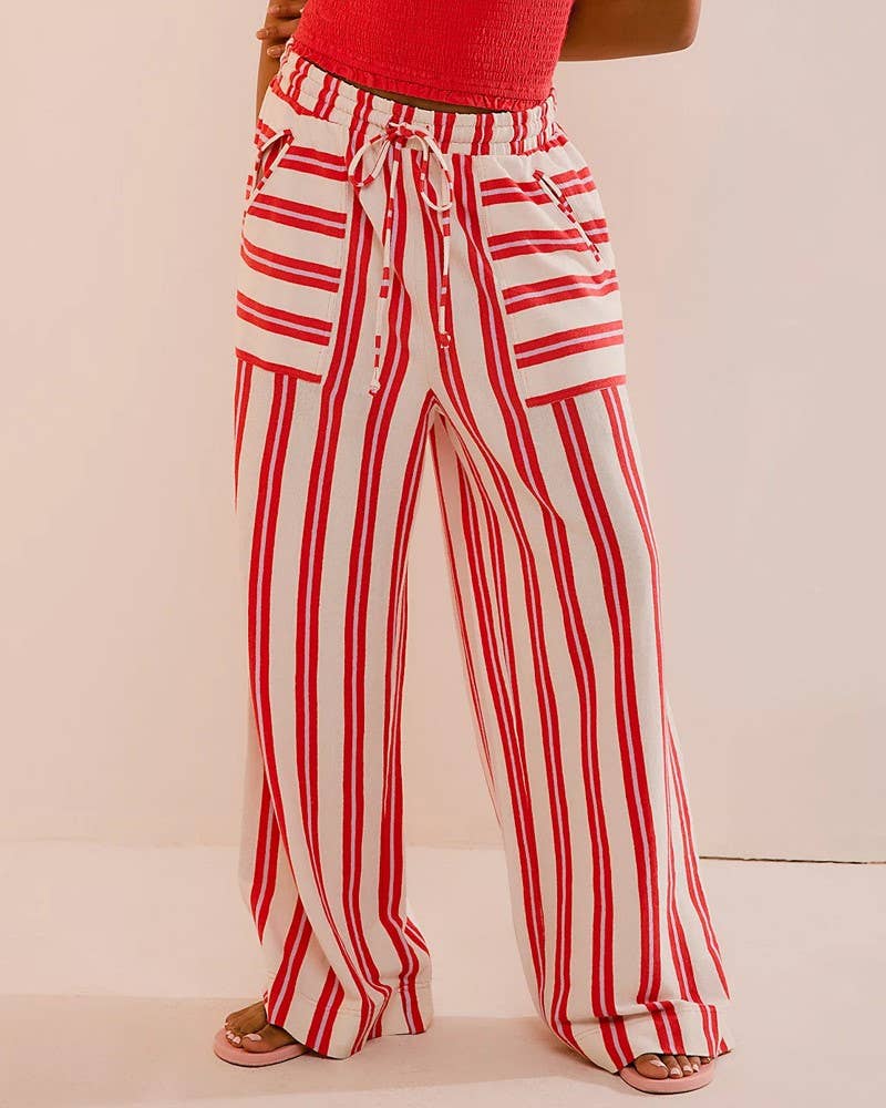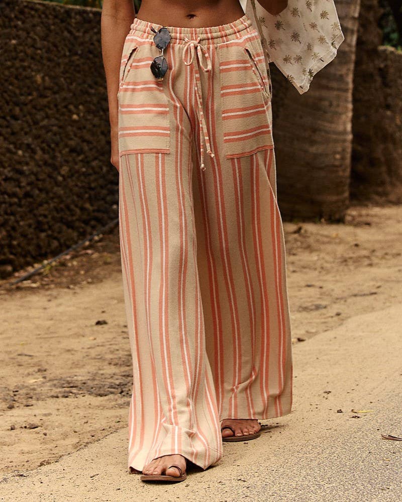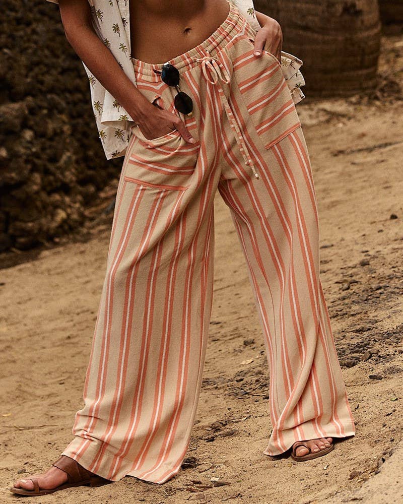 STRIPED BEACH HOMELY DRAWSTRING WIDE-LEG TROUSERS_RCJW02974